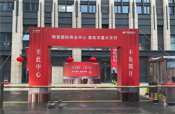 走進交房現場,映入眼簾的是濃烈的喜慶場面(miàn)。歡迎拱門、紅地毯、隨處可見的暖心標語……目之所及處處洋溢著歸家的幸福。